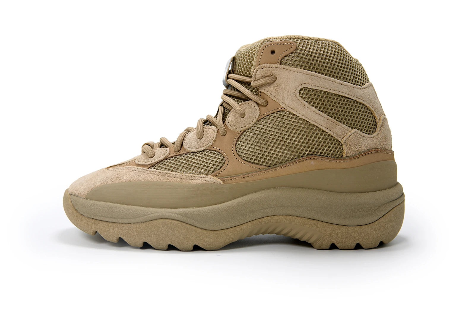 Der Adidas Yeezy Desert Boot Rock verbindet robustes Outdoor-Design mit der futuristischen Ästhetik der Yeezy-Linie und präsentiert sich in einem warmen, natürlichen Beigeton, der den charakteristischen Look des Modells prägt. Das Obermaterial besteht aus atmungsaktivem Mesh, das farblich harmonisch mit den Nubuk- und Wildlederoverlays verschmilzt und dem Schuh eine markante, dennoch cleane Struktur verleiht. Diese Kombination sorgt nicht nur für eine hochwertige Haptik, sondern auch für Stabilität und eine angenehme Passform. Die massiv gestaltete Sohle ist farblich perfekt auf das Upper abgestimmt und zeichnet sich durch ein tiefes Rillenprofil aus, das hervorragende Traktion und zuverlässigen Halt auf verschiedensten Untergründen bietet. Der Desert Boot Rock wirkt gleichzeitig funktional und stylisch – ein Modell, das sowohl in urbanen Outfits als auch in rauem Terrain überzeugt. Mit seiner durchdachten Materialwahl, dem komfortablen Aufbau und dem unverkennbaren Yeezy-Charakter ist dieser Boot eine starke Wahl für alle, die einen außergewöhnlichen, langlebigen und modisch vielseitigen Yeezy suchen.