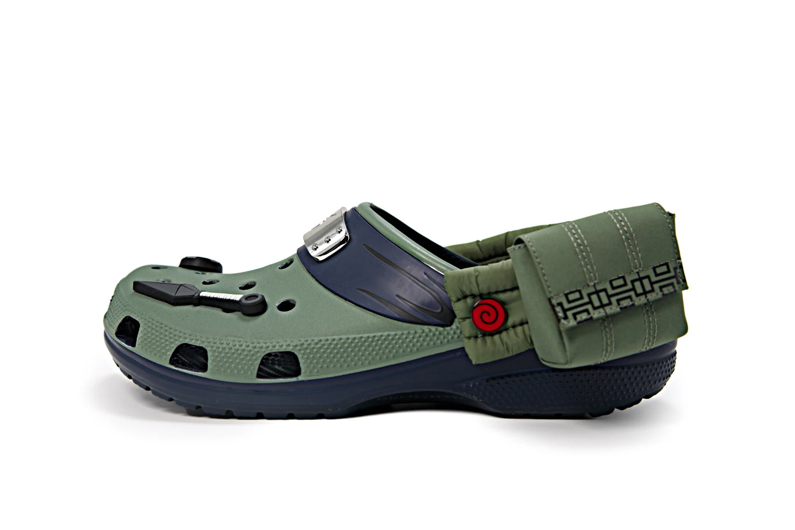 Ein besonderes Highlight ist das gepolsterte Fersenband, das nicht wie bei klassischen Crocs aus Hartmaterial besteht, sondern im Stil einer Bomberjacke gestaltet wurde – ein direkter Hinweis auf Kakashis taktische Ausrüstung. Zusätzlich befindet sich am Band ein abnehmbarer Mini-Beutel mit Druckknopf, ideal für kleine Accessoires oder als dekoratives Element.