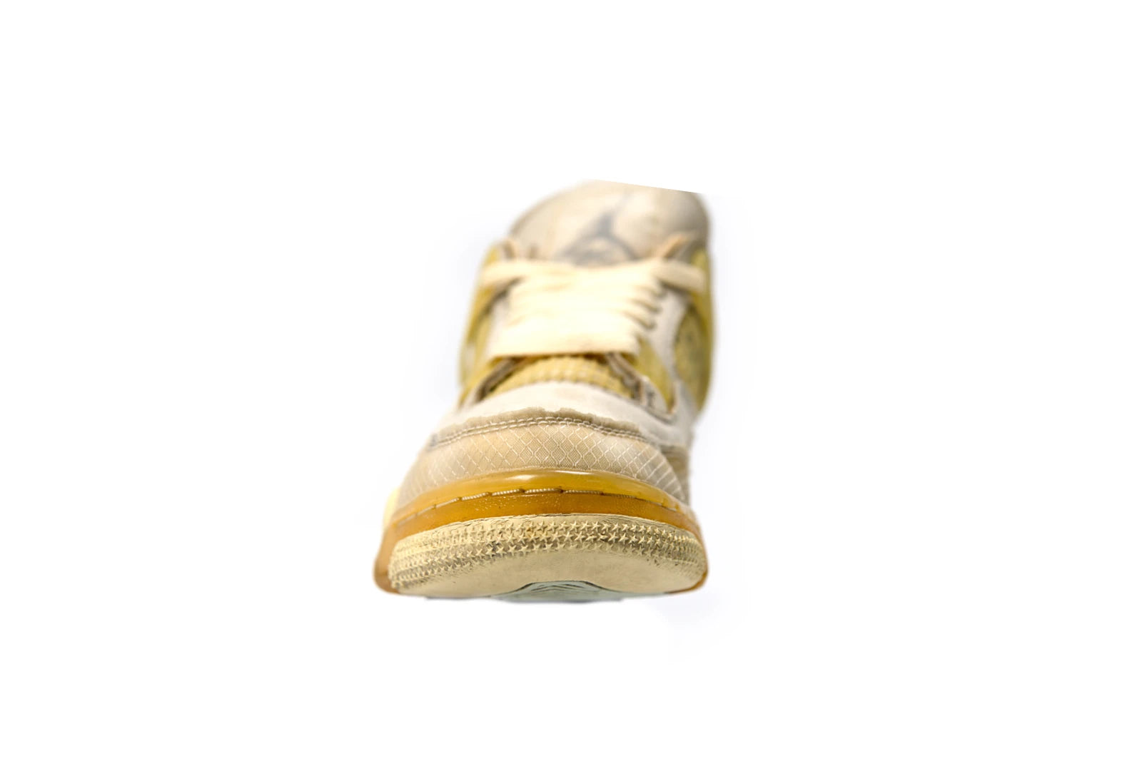 Das Obermaterial besteht aus hochwertigem Vollnarbenleder, das durch Mesh-Einsätze und strategisch platzierte transparente Panels ergänzt wird. Besonders der durchscheinende Bereich an der Zehenkappe sowie die transparente Fersenkappe verleihen dem Schuh seine moderne, futuristische Ästhetik und gehören zu den ikonischen Merkmalen von Virgil Ablohs „Ghosting“-Designphilosophie. Die sanfte Sail-Farbpalette wirkt dezent, edel und trägt gleichzeitig den experimentellen Charakter, den Off-White in jede Kooperation einbringt.