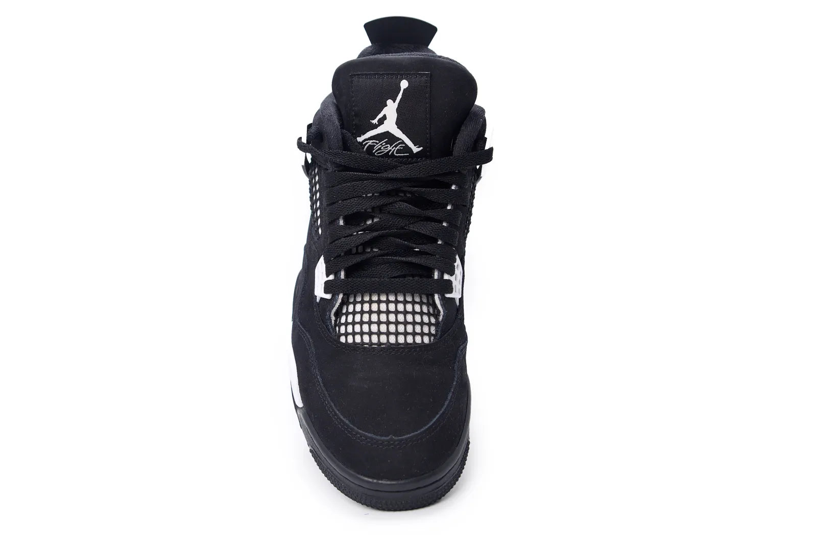 Das Upper besteht aus hochwertigem Nubuk in tiefem Schwarz, das durch weiße Akzente an Midsole, Ösen und Branding klar kontrastiert wird. Diese Farbaufteilung betont die ikonische Jordan-4-Silhouette und lässt klassische Details wie das seitliche Mesh, die markanten Wings und die stabile Fersenkappe besonders stark wirken. Die sichtbare Air-Dämpfung sorgt nicht nur für den typischen Jordan-Look, sondern auch für hohen Komfort im Alltag.