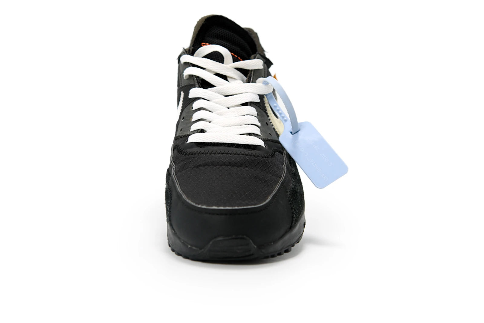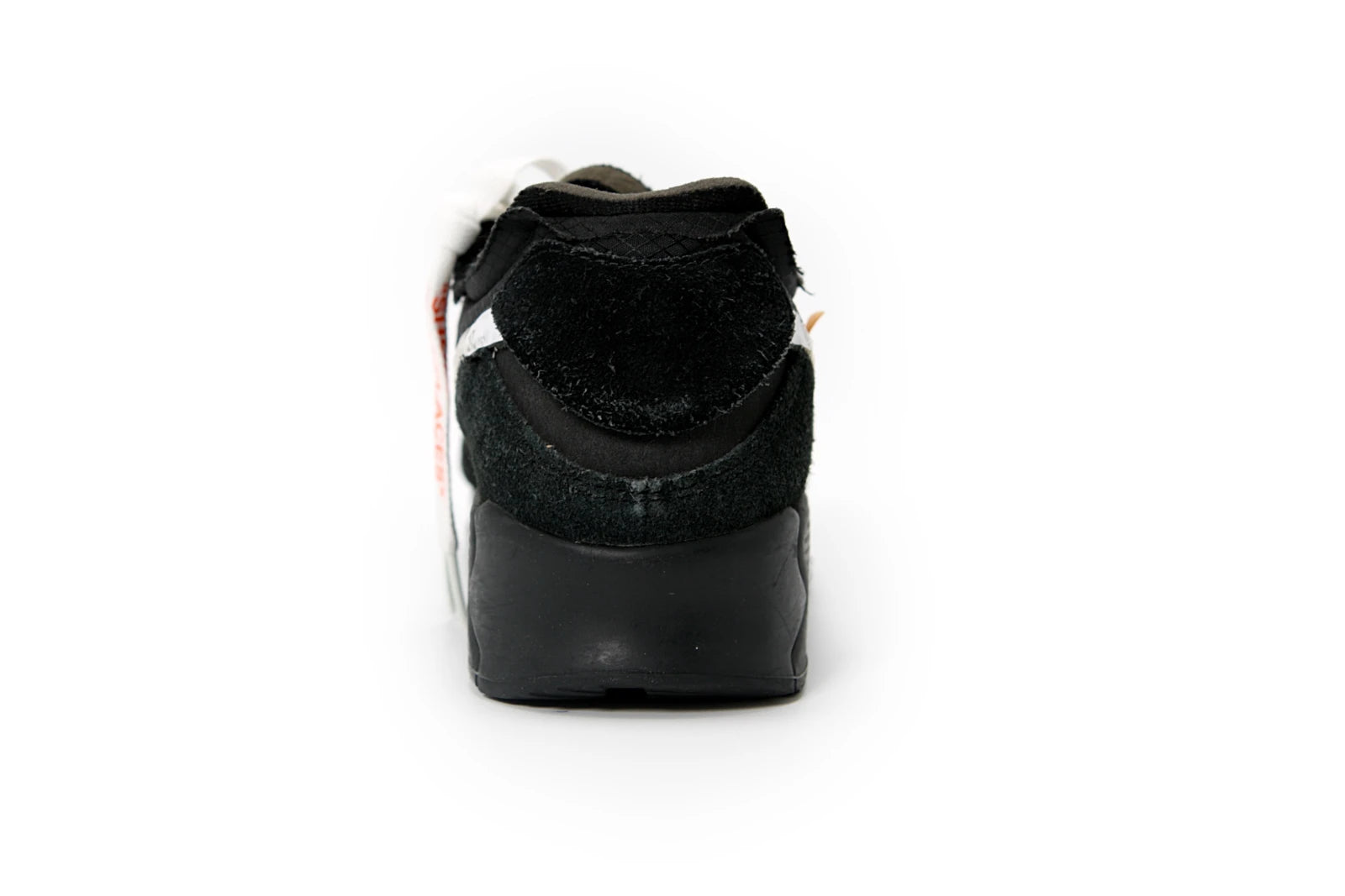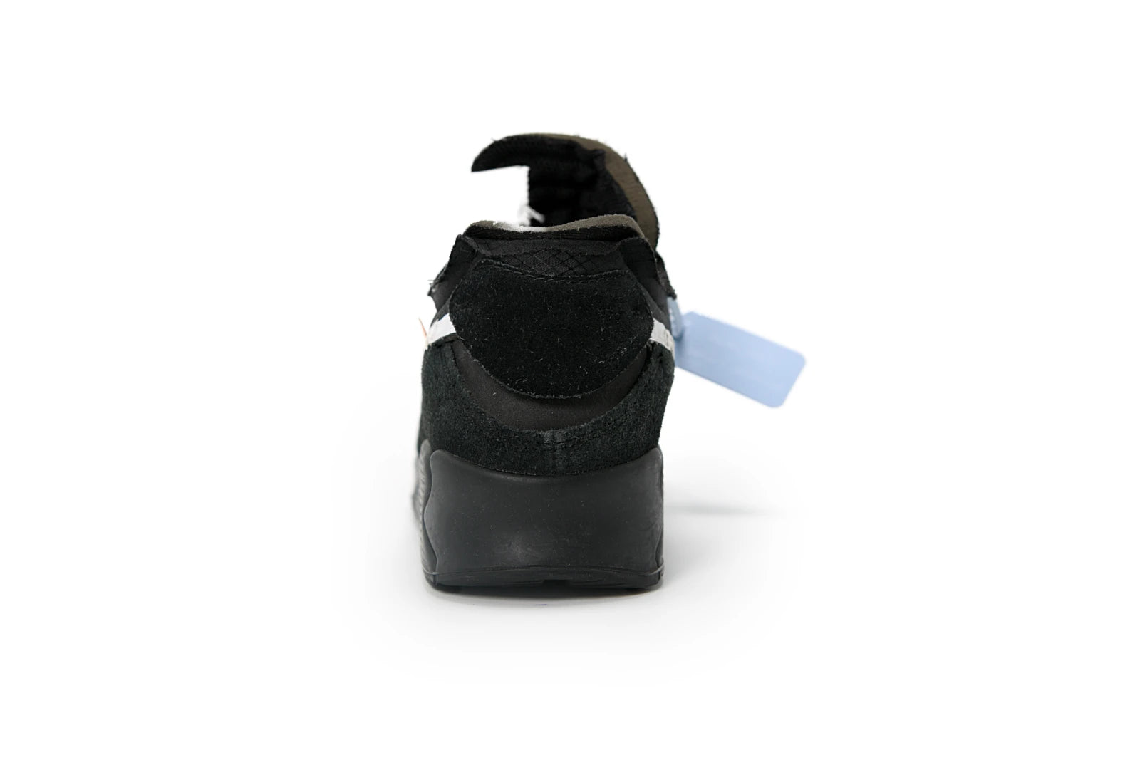 Das Obermaterial besteht aus einer Mischung aus texturiertem Mesh, strukturiertem Leder und transluzenten synthetischen Overlays, die in tiefem Schwarz gehalten sind. Durch offengelegte Nähte, freiliegende Schaumkanten und bewusst platzierte Designelemente erhält der Air Max 90 eine rohe, industriell anmutende Ausstrahlung – typisch für Virgil Ablohs Handschrift. Der seitlich platzierte Swoosh ist bewusst auffällig vernäht und wirkt wie ein grafisches Element, das die Dekonstruktion des Schuhs zusätzlich hervorhebt.
