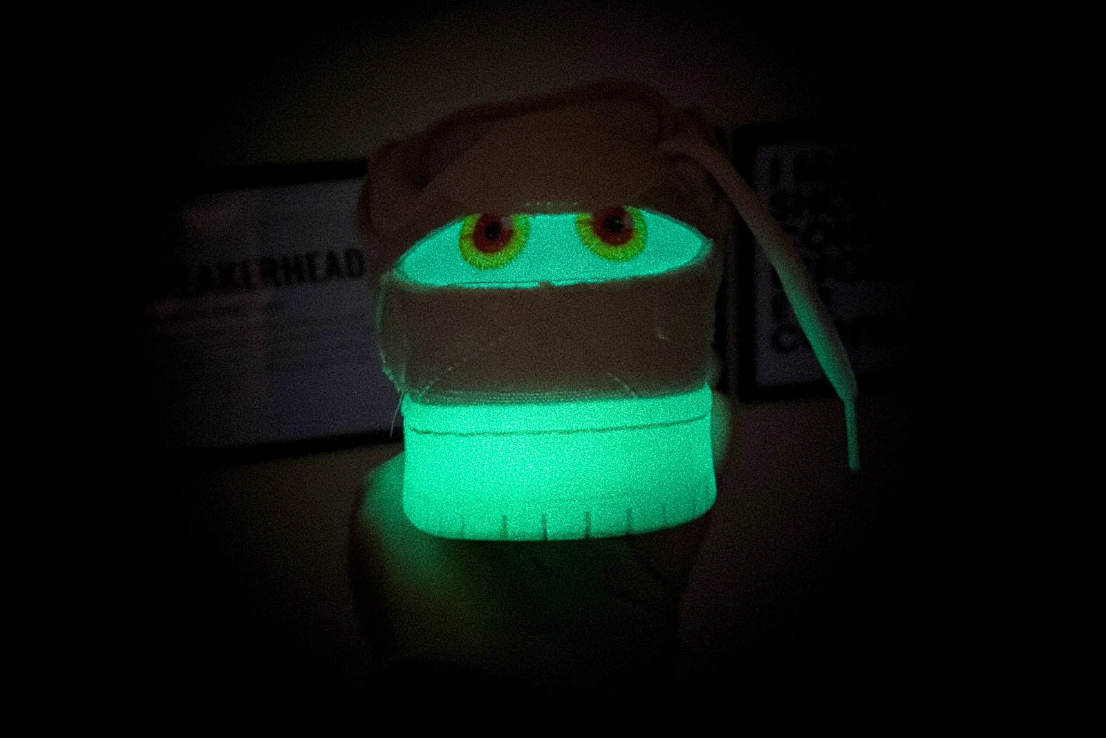 Das absolute Highlight ist der Glow-in-the-Dark-Effekt auf der Außensohle und den Augen auf der Ferse. Im Dunkeln erwachen die charakteristischen, leuchtenden Mumienaugen zum Leben und verleihen dem Sneaker einen einzigartigen, spaßigen Spezialeffekt. Auf der Innenseite der Zunge befindet sich eine kleine Spinne als Stickerei – ein weiteres liebevolles Detail, das zeigt, wie viel Kreativität in dieses Design geflossen ist.