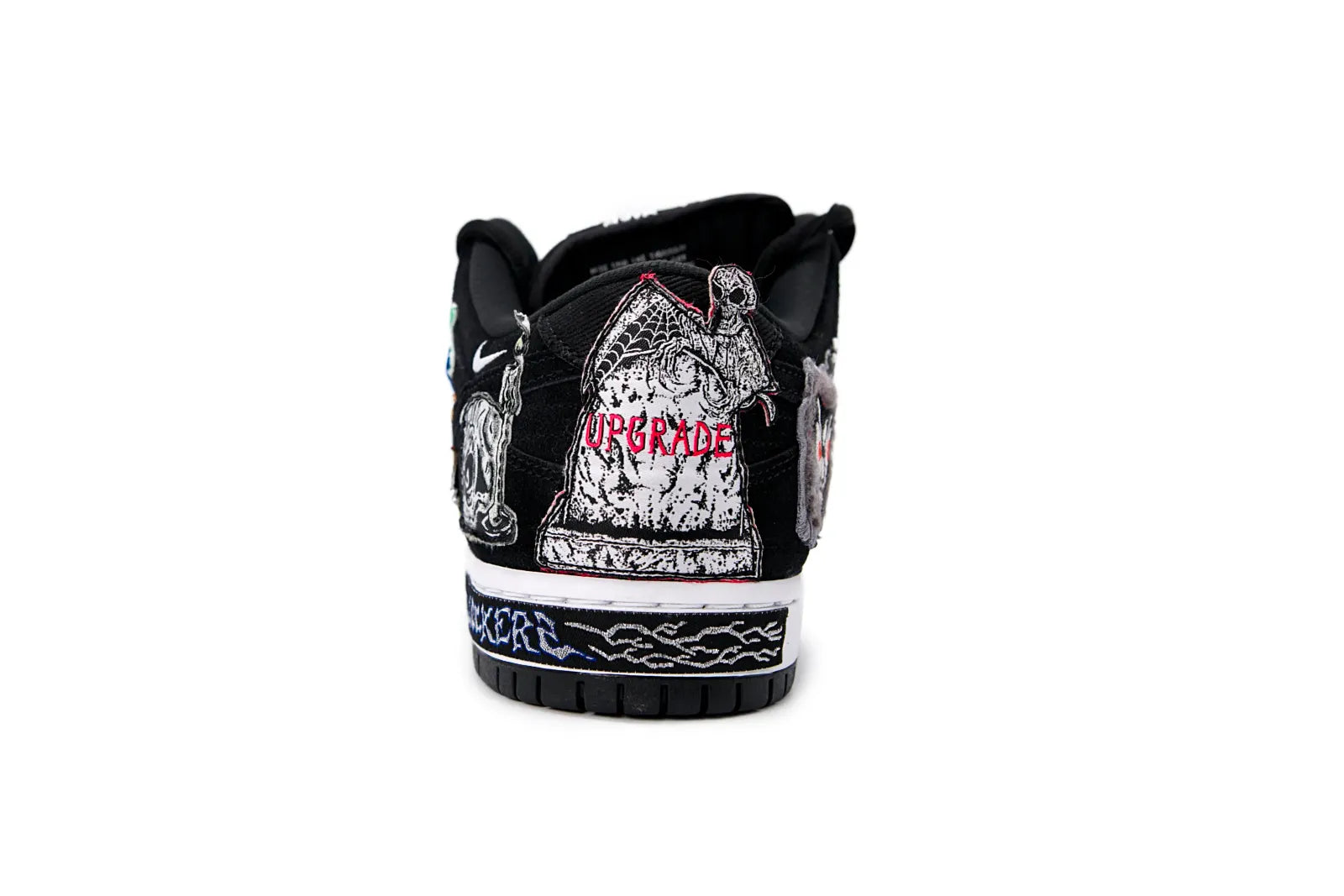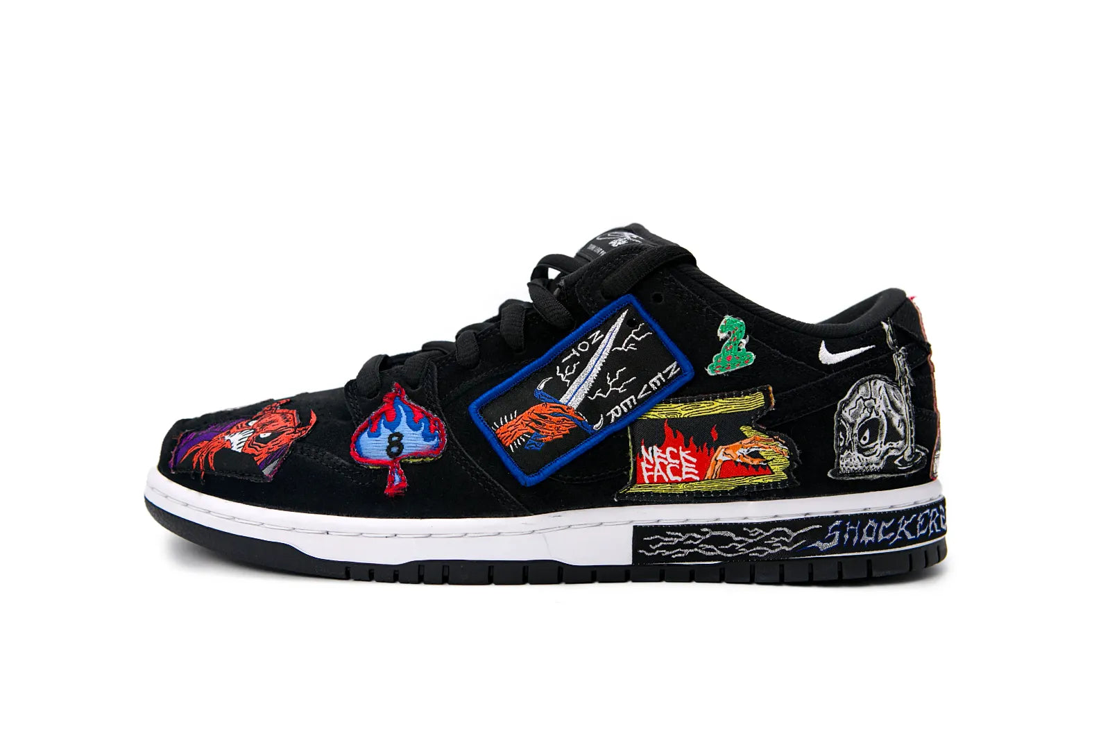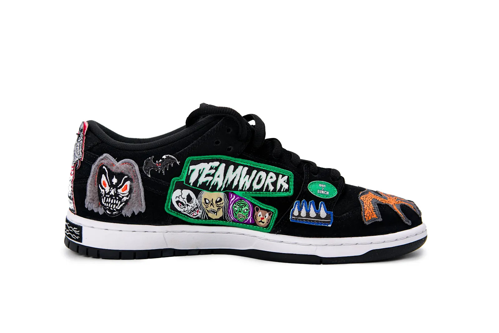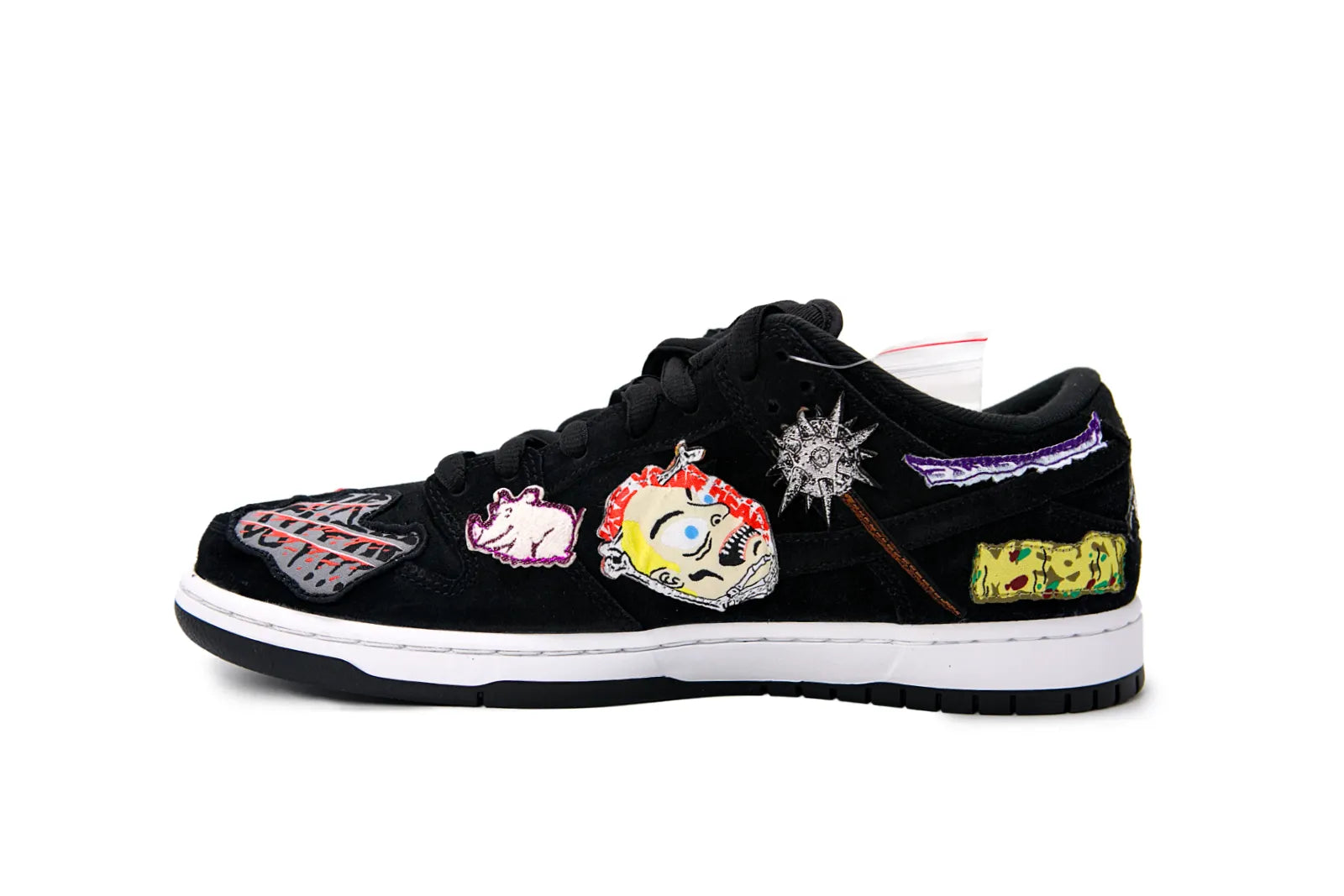 Der kontrastreiche weiße Swoosh setzt sich auffällig vom dunklen Hintergrund ab und sorgt für die notwendige Balance zwischen Kunst und der ikonischen Dunk-Silhouette. An der Ferse finden sich zusätzliche grafische Elemente, während die Zunge das klassische Nike SB Branding trägt – allerdings mit einem Twist, passend zum Kollaborationsstil. Selbst die Innen- und Außensohle enthalten kleine visuelle Überraschungen, die echten Fans sofort ins Auge springen.